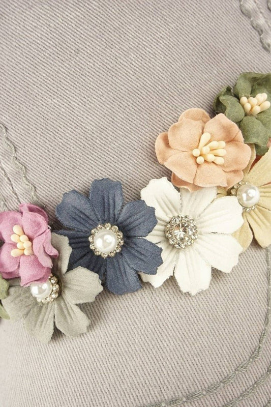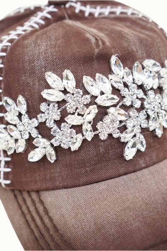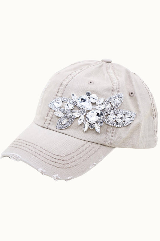 Floral Bejeweled Bling Glitz Distressed Cap, Adjustable
