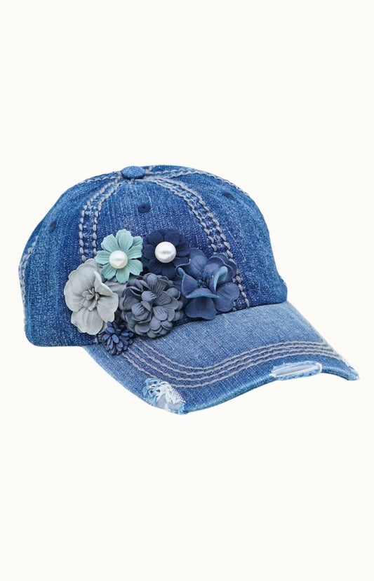 Floral Bouquet Bejeweled Bling Glitz Denim Cap, Adjustable