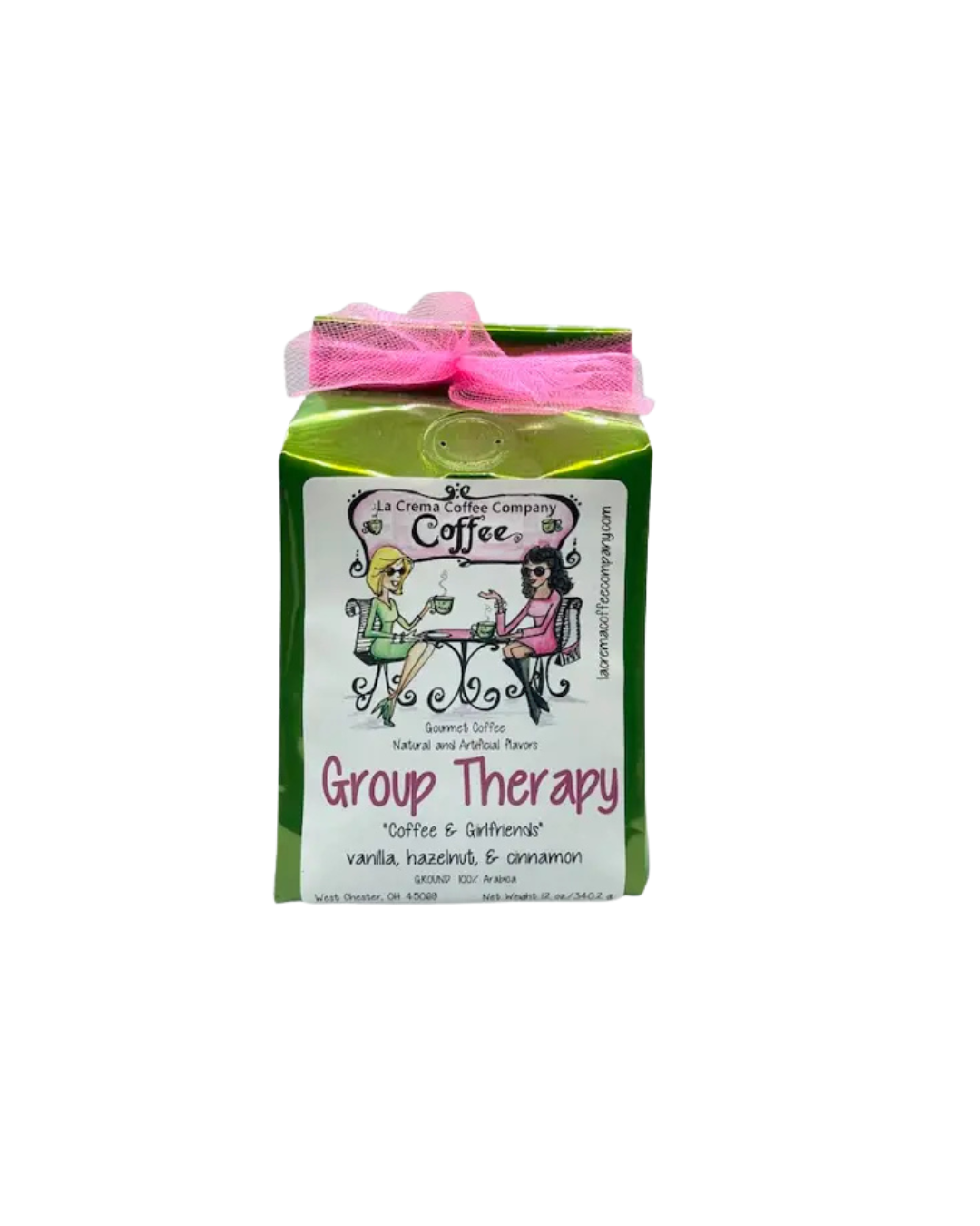 Group Therapy – Your coffee-loving squad’s new favorite! Cinnamon, vanilla, and hazelnut crumb cake comfort in a cup (Lime Green Bag)