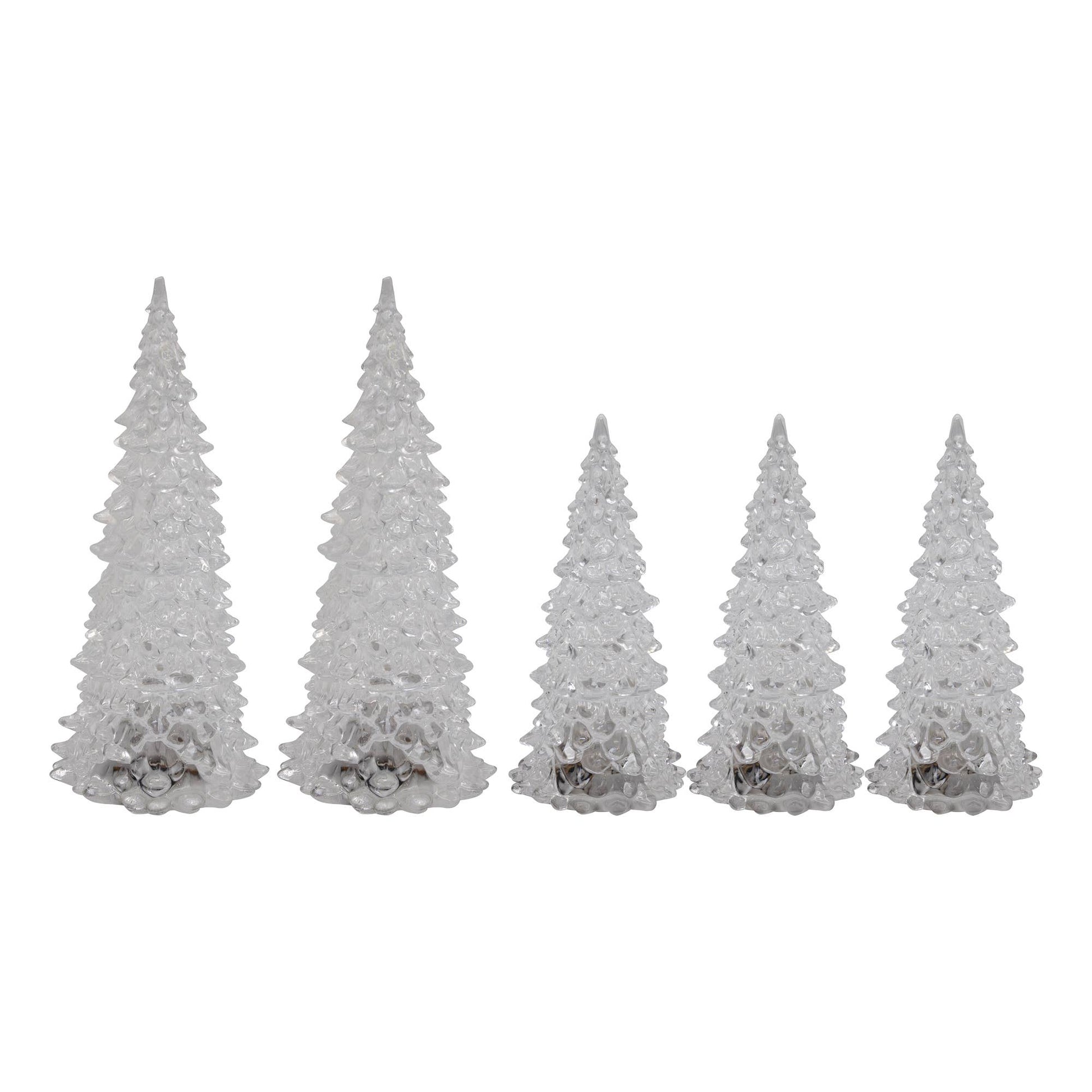 This set of five crystal clear battery operated trees will add an elegant touch to your holiday décor. These sturdy plastic trees are filled with warm white LED fairy string lights equipped with a timer for 6 hours on and 18 hours off. They will add a delightful glow anywhere you place them, whether it's on a mantel, tabletop, or shelf. Each tree requires 2 AAA batteries (not included).